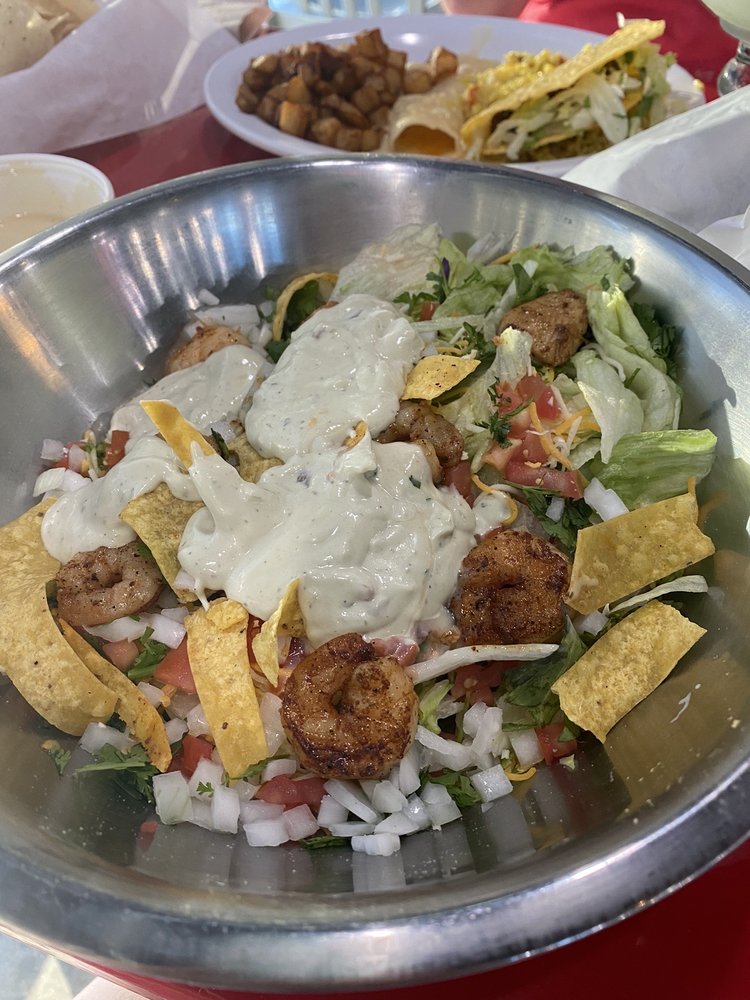 Lightly battered & fried shrimp served on a fresh lettuce blend topped with tomatoes, onions, shredded cheese, feta, cilantro, tortilla strips, and your choice of dressing.
